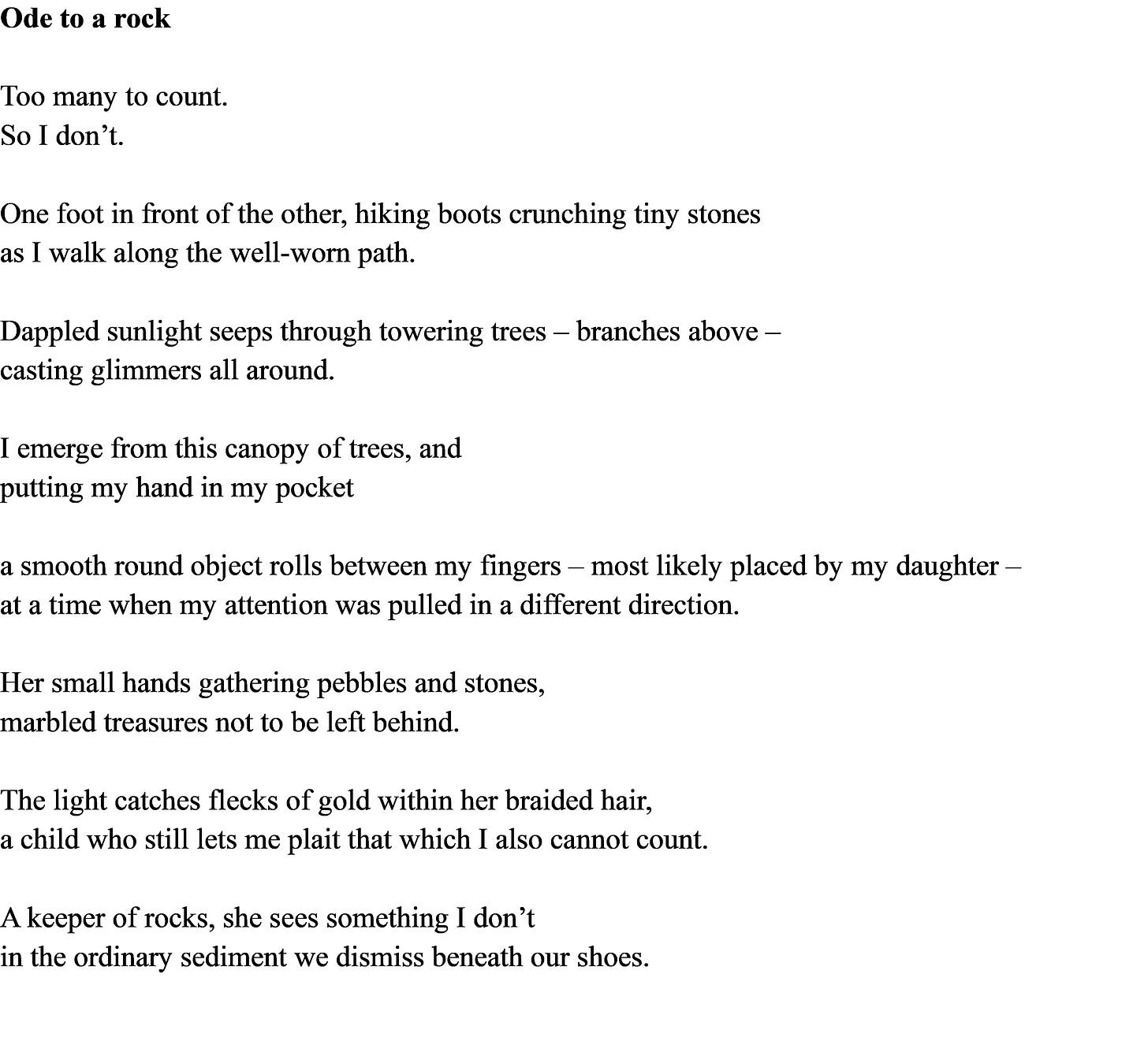 Author’s notes: Ode to a rock is one of my favorite poems. Much of my work focuses on my relationship with my children, and the wonder and mystery they bring to our daily lives. As adults, we often forget to notice the beauty in the ordinary (or not so ordinary when we really think about it.) The way in which children observe and notice objects or elements we simply dismiss, such as a rock, is in part what inspired this poem. I hope you enjoy it, and as always, thanks for reading. :)